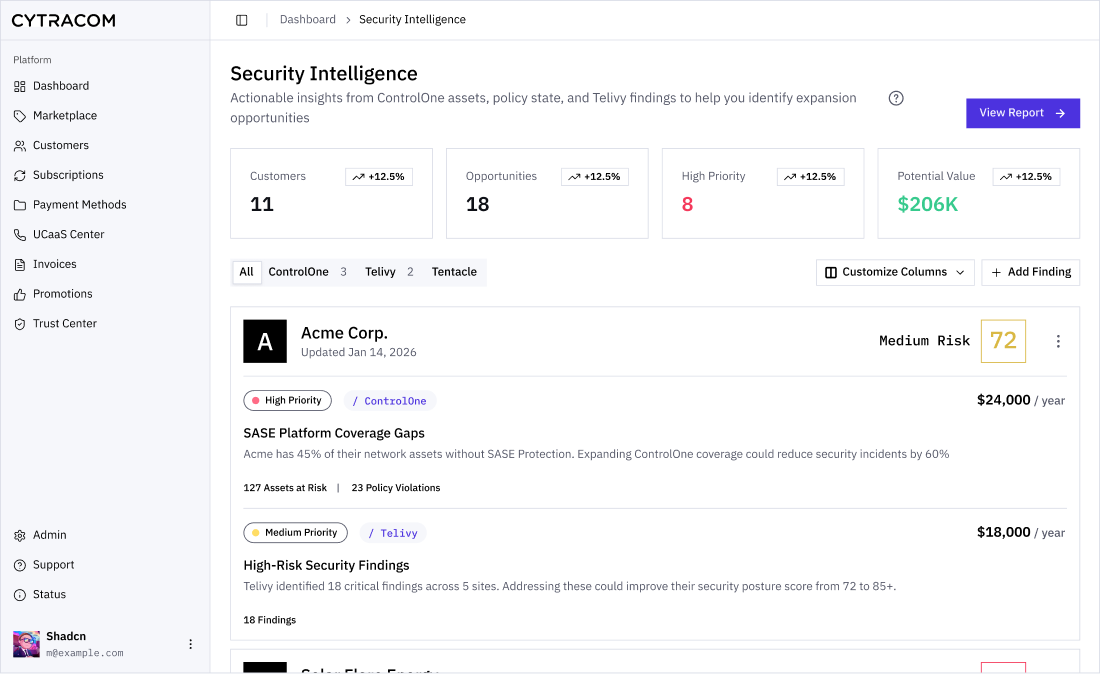 Unity brings your Cytracom services together with one portal, one identity, and one customer record, then highlights coverage gaps, new capabilities, and next-best actions to help you standardize and expand faster.